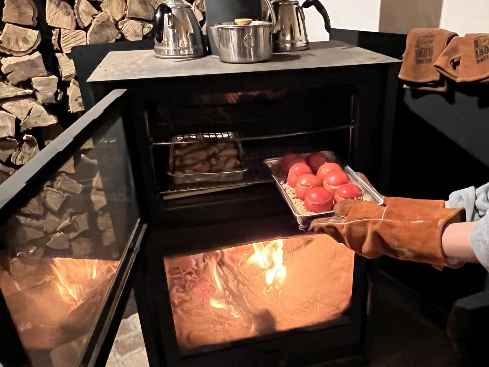薪ストーブでヌクヌクになりながら、とろとろチーズフォンデュと