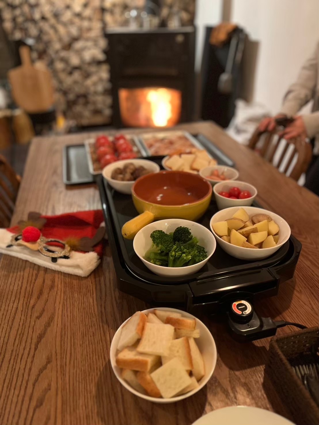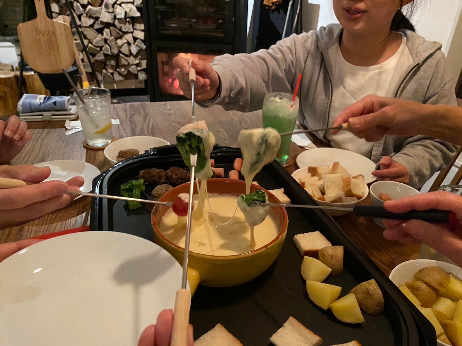 薪ストーブでヌクヌクになりながら、とろとろチーズフォンデュと