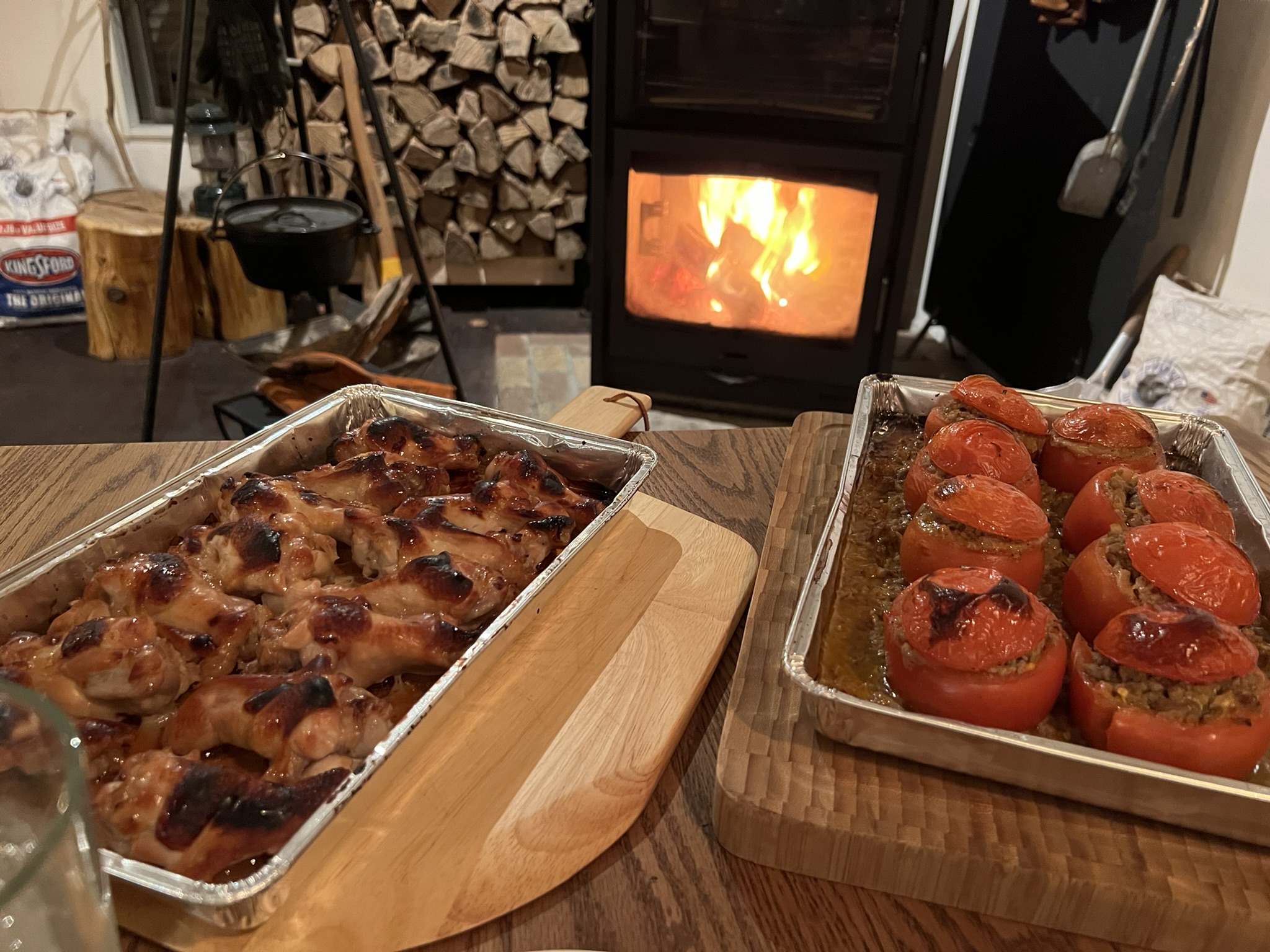 薪ストーブでじっくり焼いた「チキン手羽元はちみつロースト」と「トマトファルシ」をお楽しみください