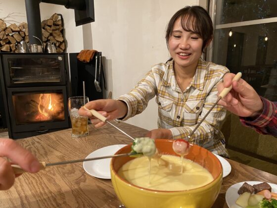 薪ストーブの炎と大きなツリーのイルミネーションを眺めながらクリスマス気分を。