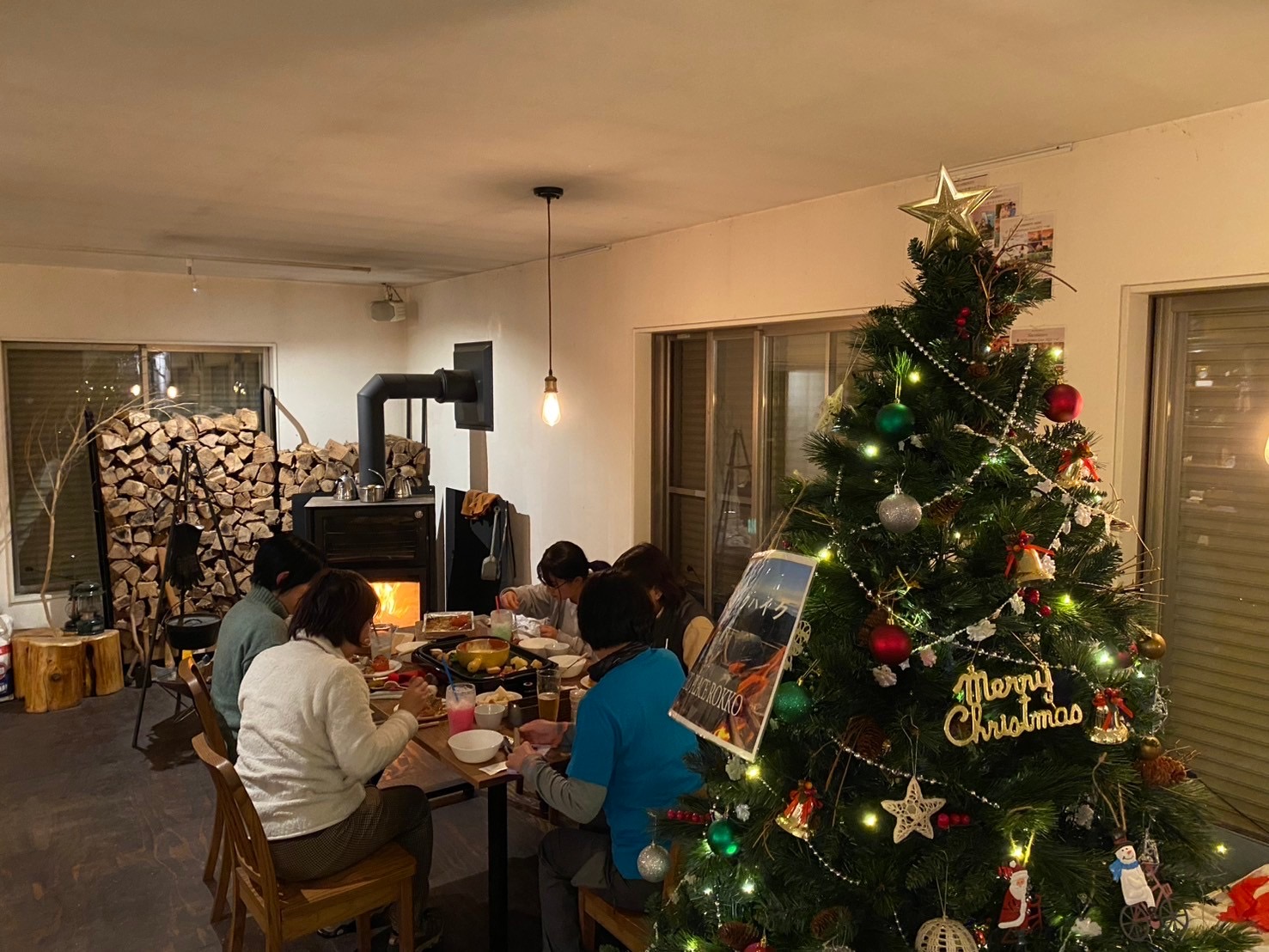 薪ストーブの炎と大きなツリーのイルミネーションを眺めながらクリスマス気分を。