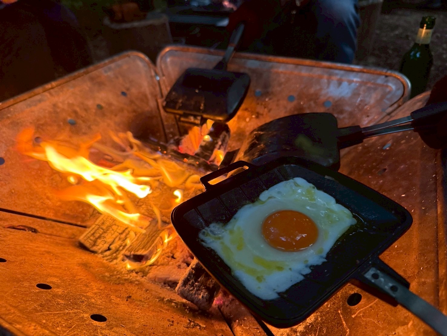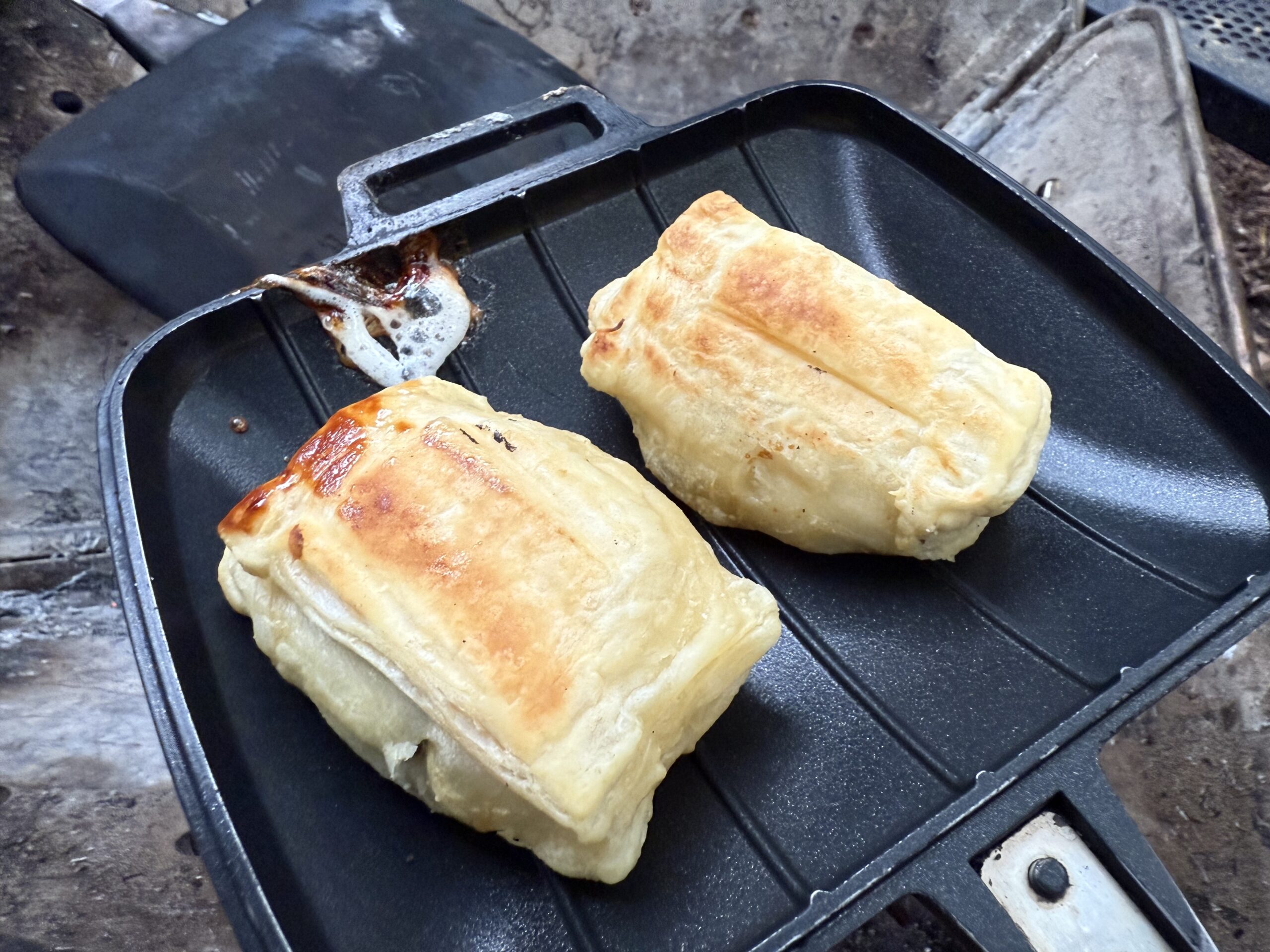 ランチは、手焼きホットサンドメーカーでいろんなクッキングにチャレンジ(当日の熱源は焚火ではなく炭火)